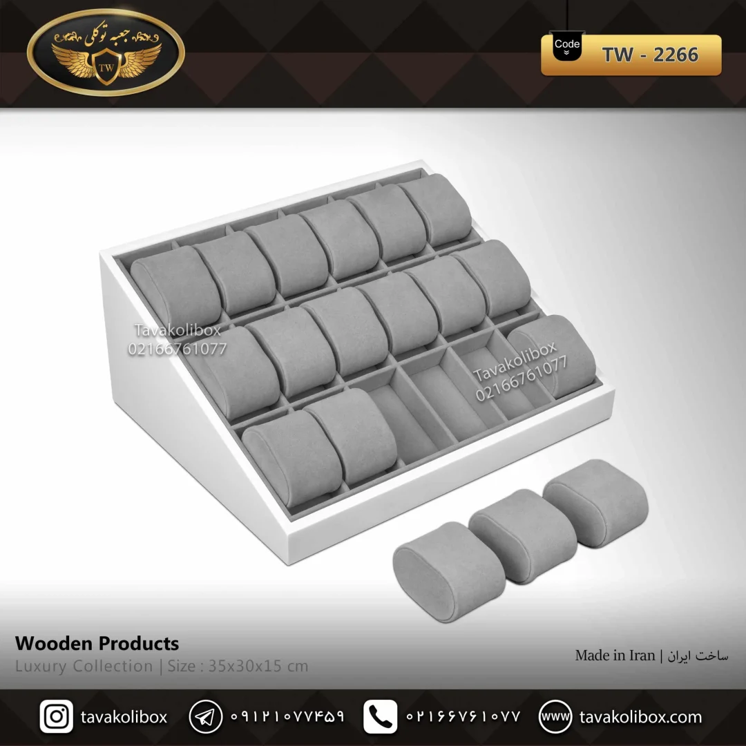 TW-2266 یک استند ۱۸ خانهی سفید، شیبدار و بالشتک لوکس است که ظرفیت بسیار بالا را با بالاترین کیفیت نمایش و محافظت ترکیب میکند و انتخابی عالی برای ارائهی مجموعه ساعتهای باارزش در یک قاب زیباست.