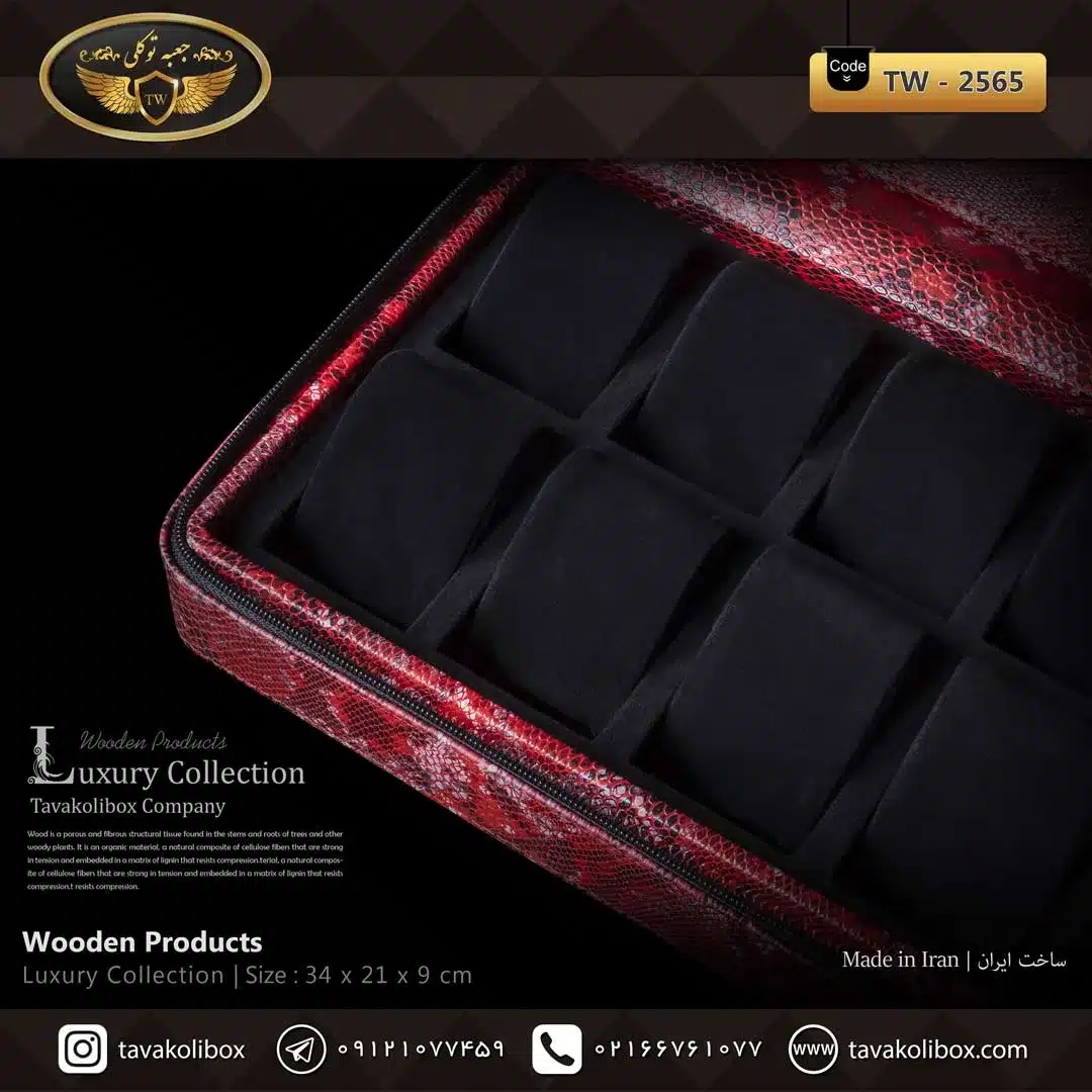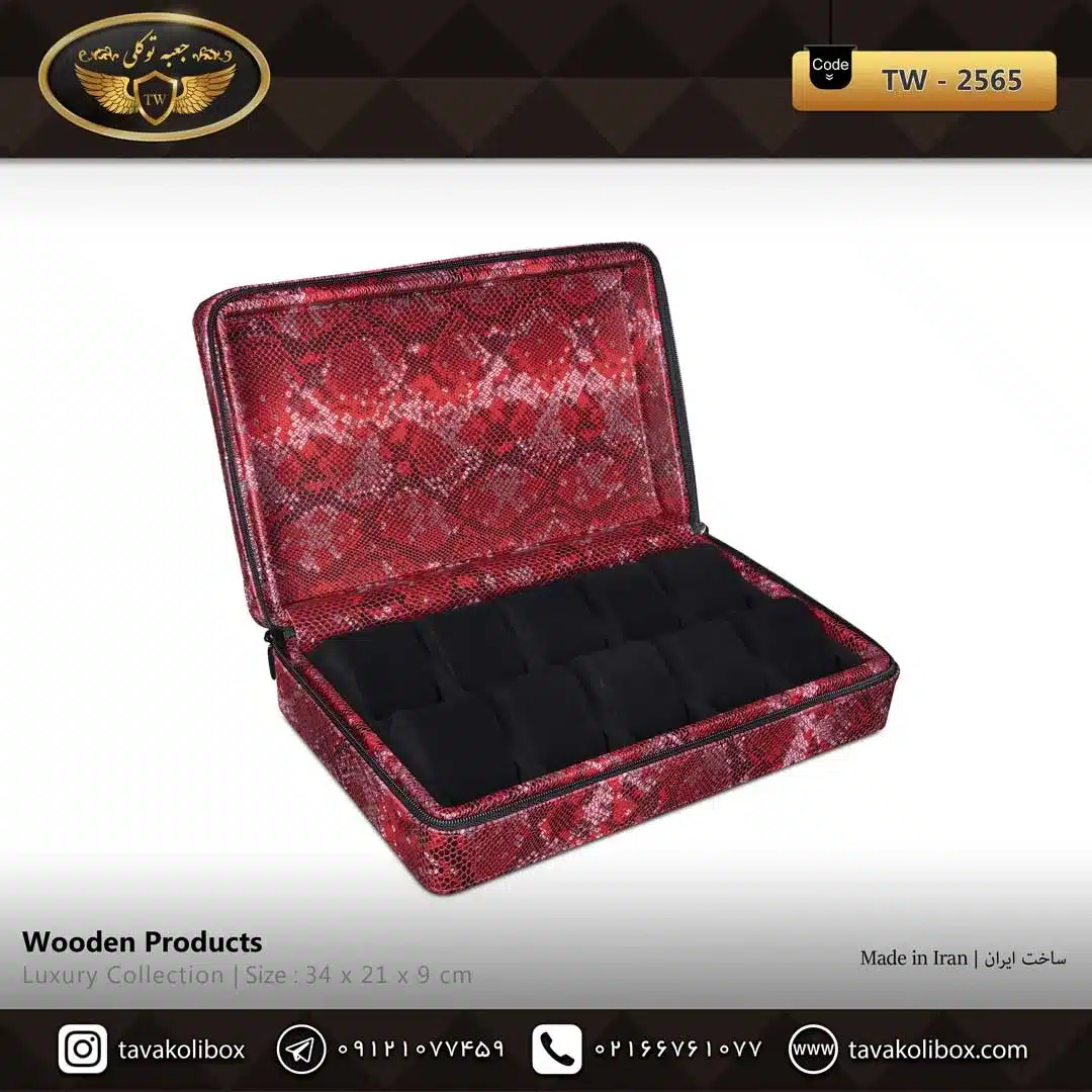 - مدل TW‑2565 اوج تجمل و امنیت را در نگهداری ساعتهای شما به نمایش میگذارد. این یک جعبه ۱۰ خانه است که تمامی نیازهای یک کلکسیونر جدی را برآورده میکند: سوپرلاکچری بودن، محافظت کامل با زیپ، و راحتی استفاده با بالشتکهای لوکس در رنگ چشمگیر قرمز.