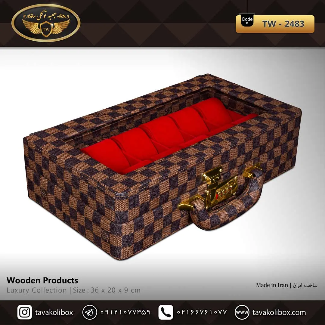 جعبه ساعت 6 خونه سوپرلاکچری درب دار بالشتک لوکس چرم طرح نقش جهان مدل : TW-2638