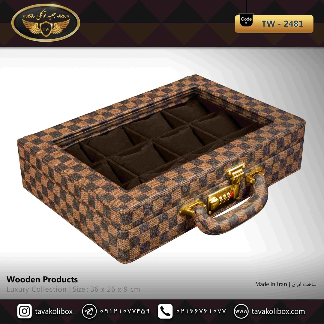 جعبه ساعت مدل TW-2481 محصولی با ظرفیت بالا و طراحی سطح سوپرلاکچری است که با الهام از بافت کلاسیک چرم چهارخانه (Tartan/Checkered Leather) در رنگ قهوهای، شکوهی سنتی و غنی را به نمایش میگذارد.