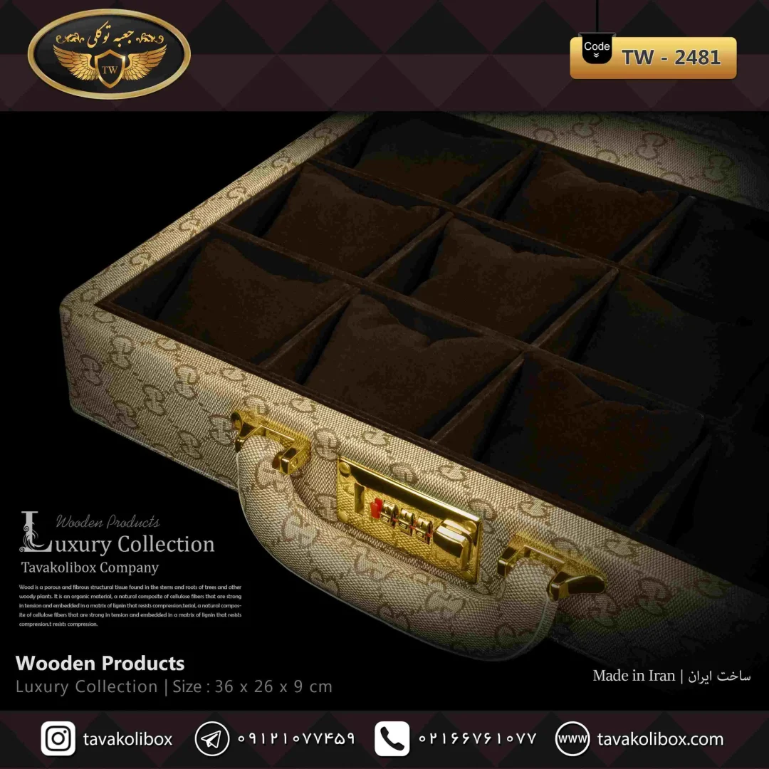 مدل TW-2481 یک جعبه ساعت طراحی شده برای نگهداری مجموعهای از ساعتها است. این مدل به عنوان یک محصول سوپرلاکچری دستهبندی میشود و ظرفیت نگهداری ۱۲ عدد ساعت را دارد. از نظر ساختار مواد، این جعبه از جنس چرم ساخته شده است که حس لوکس بودن را القا میکند. رنگ این چرم نسکافهای (یک رنگ قهوهای روشن و گرم) انتخاب شده است. همچنین، برای جای دادن ساعتها، از بالشتک معمولی در این مدل استفاده شده است. در جمعبندی، TW-2481 یک جعبه ساعت چرمی ۱۲ خانه با روکش نسکافهای و بالشتک استاندارد است که در بالاترین سطح کیفیت (سوپرلاکچری) قرار دارد