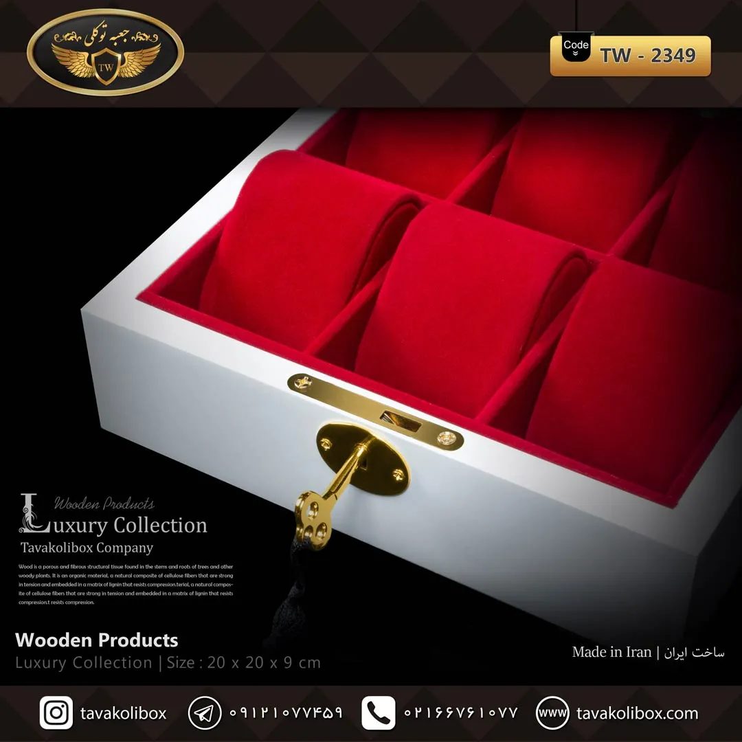 جعبه ساعت 6 خونه کلیددار رنگ سفید-قرمز مدل : TW-2349 از متریال مرغوب ساخته شده است و برای نمایش و نگهداری انواع ساعت به کار میرود.