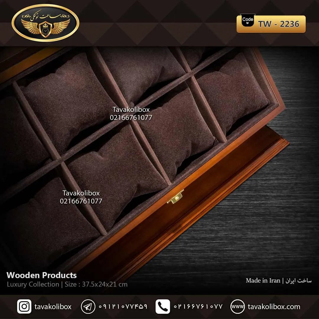 مدل TW‑2236 بر روی ظرفیت و کاربردی بودن تمرکز دارد. رنگ قهوهای آن، فضایی گرم و سنتی ایجاد میکند که برای انواع ساعتها مناسب است. طراحی اوریب (احتمالاً شیبدار بودن سطح داخلی یا چیدمان خانهها به صورت مورب) دسترسی به ساعتها را به جای باز کردن کامل درب، سادهتر میکند. استفاده از بالشتک معمولی، این مدل را به یک گزینه اقتصادی و با دوام برای نگهداری حجم بالایی از ساعتها تبدیل میکند.